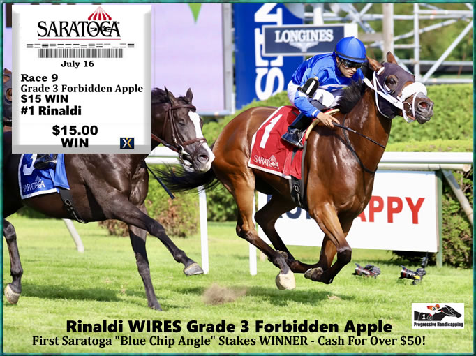 Saratoga kicked off the week of racing on Wednesday and I had picks all the way through Sunday evening. This week was NOT the kind of week to brag about, but I felt better when I turned on the TVG broadcast on Sunday and both analysts remarked how they had suffered through a "tough day" on Saturday. Yeah...me too, and that was true for most of the week. But hey, you keep on firing and I KNOW that at some point the numbers will even out. The racing began on Wednesday when I was visiting the grandsons in Cape Coral. Began the day by running a distant 7th at even money then thought I had a chance on the far turn at 8/1 before fading to 8th. In the 9th, a nine furlong event I went with Forza di Oro who was trained by Hall of Famer Bill Mott. Pressed the issue to the far turn then took over and ran away impressively, so much so that talk afterwards was we might see him next in one of the big graded stakes at the Spa.