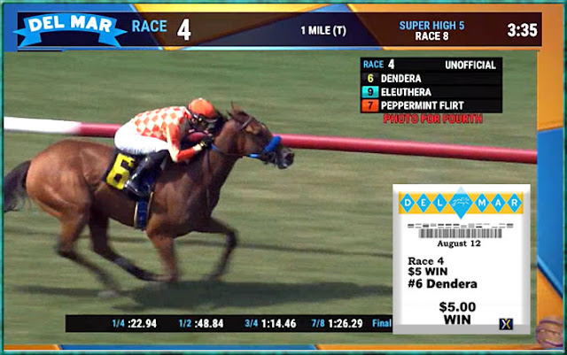 Right back in the fourth with Dendera who was NOT an angle play, but I liked her anyway. This was a MSW for juveniles going a mile on the turf. She'd debuted in a dirt sprint and was an even fifth. In spite of the less than inspiring first start, and the stretch out in distance she was the morning line favorite; she was Brad Free's top pick; sent out by top trainer John Sadler who had more combined wins with first time turfers than the other trainers in the race combined. AND he was a big $3.43 ROI with second time maidens. Finally, add in top rider Flavian Prat. Oh my. Because it wasn't an "angle" play I only went in for the minimum. Tracked the leaders and held confidently by Prat 2nd into the far turn. Took off and ran away very impressively. Paid a generous $6.20 so I collected over $15 on the minimum play.