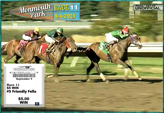 The next bet was also from Maryland. My original plan was to bet Brittany Russell's first time starter, Click To Confirm with a minimum play because I did NOT like the prohibitive 7/5 morning line choice. But when that one scratched everyone joined my selection and so I upped the bet. Tracked the leaders through the far turn, drew on even terms at the top of the lane and edged clear in the final 100 yards for the win at 4/5. The double investment got me back almost $20.