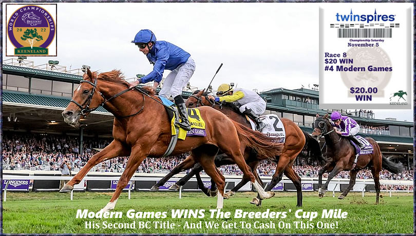 Ran off the board in the BC Turf Sprint where Golden Pal was shuffling around and unprepared for the start - just deadly for a front runner.  Missed again when Cyberknife was second in the BC Dirt Mile (but I "cashed" thanks to the promotion).  In the BC Filly & Mare Turf I did not bet on "MY horse" Going To Vegas who I thought was overmatched and probably wouldn't make the lead - which she didn't.  I took the European Nashwa who was 4th at 5/2.  In the BC Sprint I had my doubts about the sensational Jackie's Warrior.  His two previous losses in Breeders' Cup company were worrisome as was his disappointing second last time out.  But I thought there was a CHANCE he'd run big.  Made a bid at 3/5 but flattened out to finish third (but again, I "cashed" thanks to the promotion).  The Breeders' Cup Mile was next and I really liked Modern Games.  First, he'd won the BC Juvenile Turf last year, but I'd not cashed on him because he was mistakenly "scratched" at the gate, then allowed to run but for purse money only.  I had him in the Grade 1 Woodbine Mile and trainer Charlie Appleby was scoring at an insane 50% plus with his Godolphin shippers.  Made a sweeping run to the front and scored as my first "prime time" bet of the weekend as I collected nearly $50!