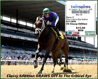 So for the day Sunday I finished 5-for-10 and a flat bet profit. Well done. Monday, Memorial Day we made plans to spend the afternoon at our oldest son Jeff's new home in Boca Raton so I began putting in my wagers online a little before noon. I had a few selections from Lone Star Million Day in Texas but couldn't find their track on the menu. I recalled that months ago I had wanted to play Sam Houston race track in Houston and found out that the state of Texas was in a dispute with horsemen and was blocking the simulcast signal from going out. Certainly this wasn't STILL the case - yes it was. We were with family until about 5pm so when we arrived home I ran through the replays. It was Big Apple Showcase Day in New York with several state-bred stakes. I won with two of them, both added money bets. In the Critical Eye going a one-turn mile and a sixteenth Classy Edition pressed the pace then drew off impressively. But in the mile and a sixteenth turf route that was the Kingston Stakes, City Bay ran into traffic problems rallying from the back when turning for home. Got free a little before the furlong pole and flew home to be J-U-S-T up in time with my prime time bet on board.