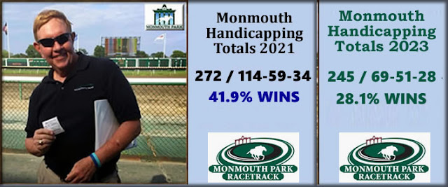 With the summer season coming to a close I ran through all my numbers. The first thing worth noting was how Monmouth played out. I always play every Monmouth live card from May through Labor Day for two reasons. First, I like having a track to play consistently through the summer, like Gulfstream in the winter. And Monmouth is ideal because (a) it doesn't start until May so I get at least a month "off" from daily handicapping at Gulfstream, and (b) because they only run three days a week it's not as "demanding." I also have come to enjoy playing Monmouth because for many years now the races almost always are either oh-so-obvious or a "go figure" kind of race. And with the way I manage my money I have always done well at Monmouth. But throughout this summer, nearly every day the cards on the Jersey Shore were filled with runners that just were hard to figure. I knew I wasn't doing as well for the summer in general, especially during the month of August, but I also felt like the Monmouth selections really were pulling down my numbers. Sure enough - look at the comparison between Monmouth 2023 and Monmouth 2021: